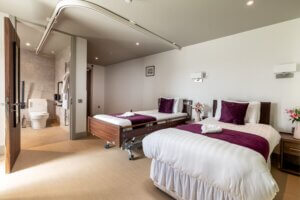 The Premium Accessible room features a profile bed, a standard bed, a ceiling hoist and a private patio.
