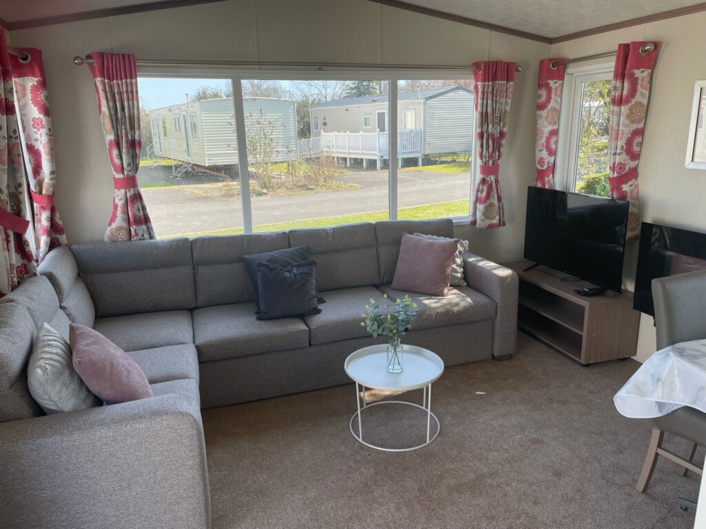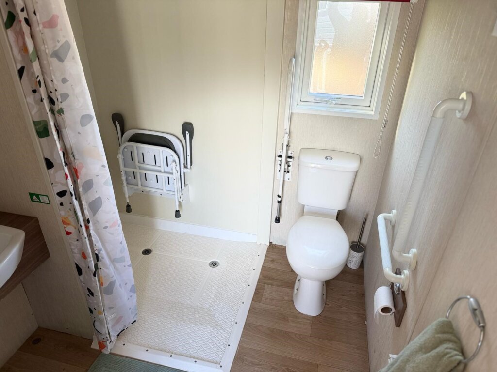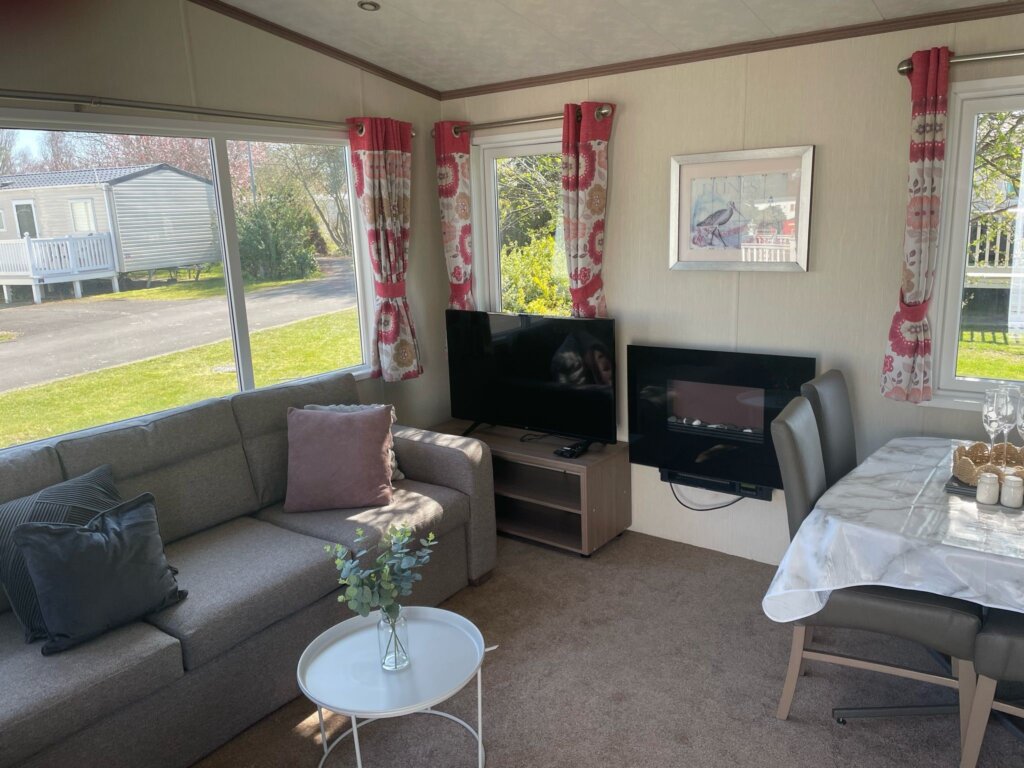 The caravan has its own reserved disabled parking space, ramp access, and a spacious accessible wet room. Inside, the layout is light and welcoming, with an open-plan living and dining area featuring comfortable sofas, electric fire, Smart TV, and a free-standing dining table and chairs.