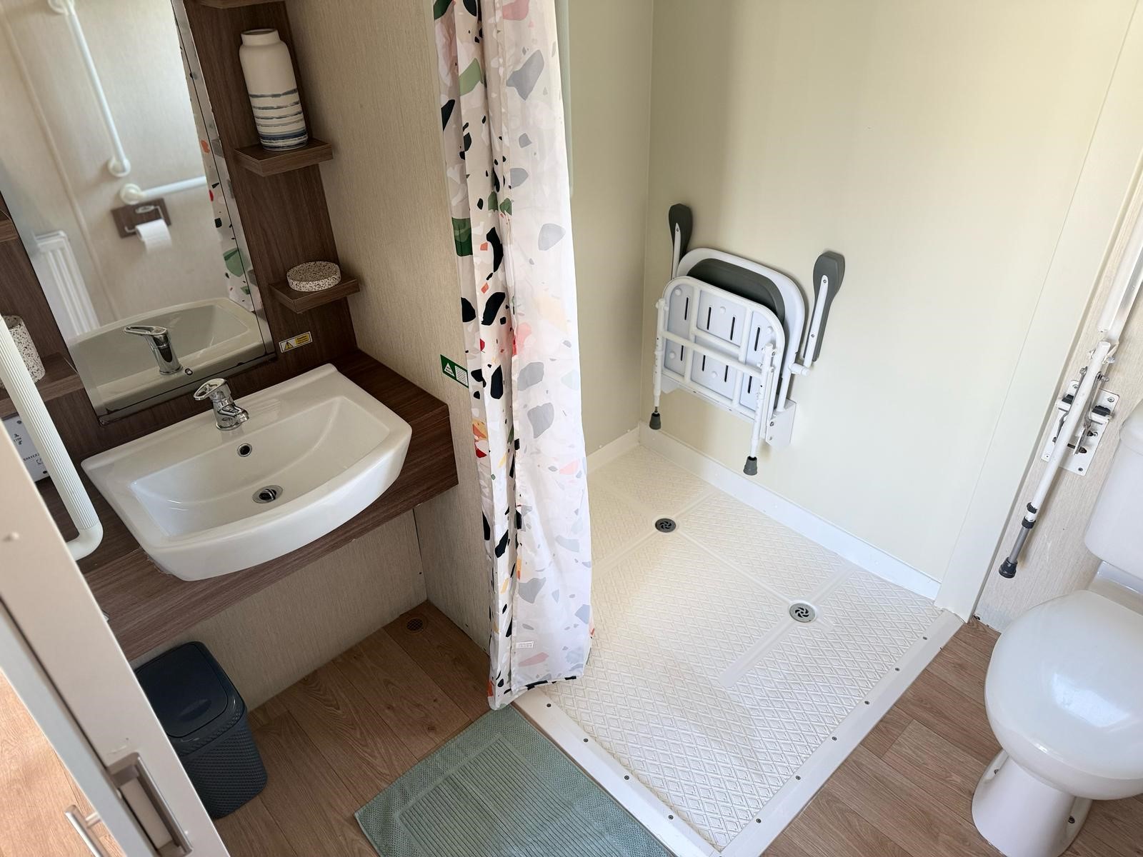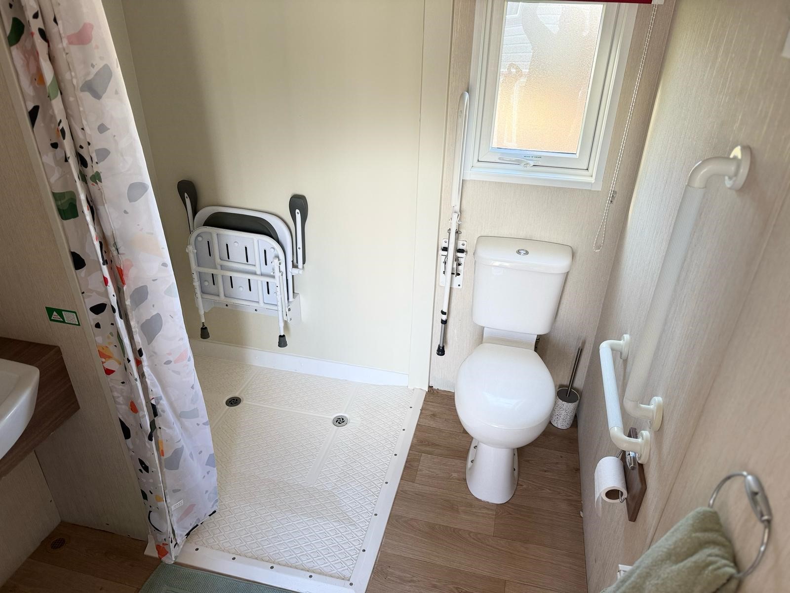 The accessible wet room includes a step-free, roll-in shower with fixed grab rails, a wall-mounted shower seat, and a WC with a drop-down grab rail.